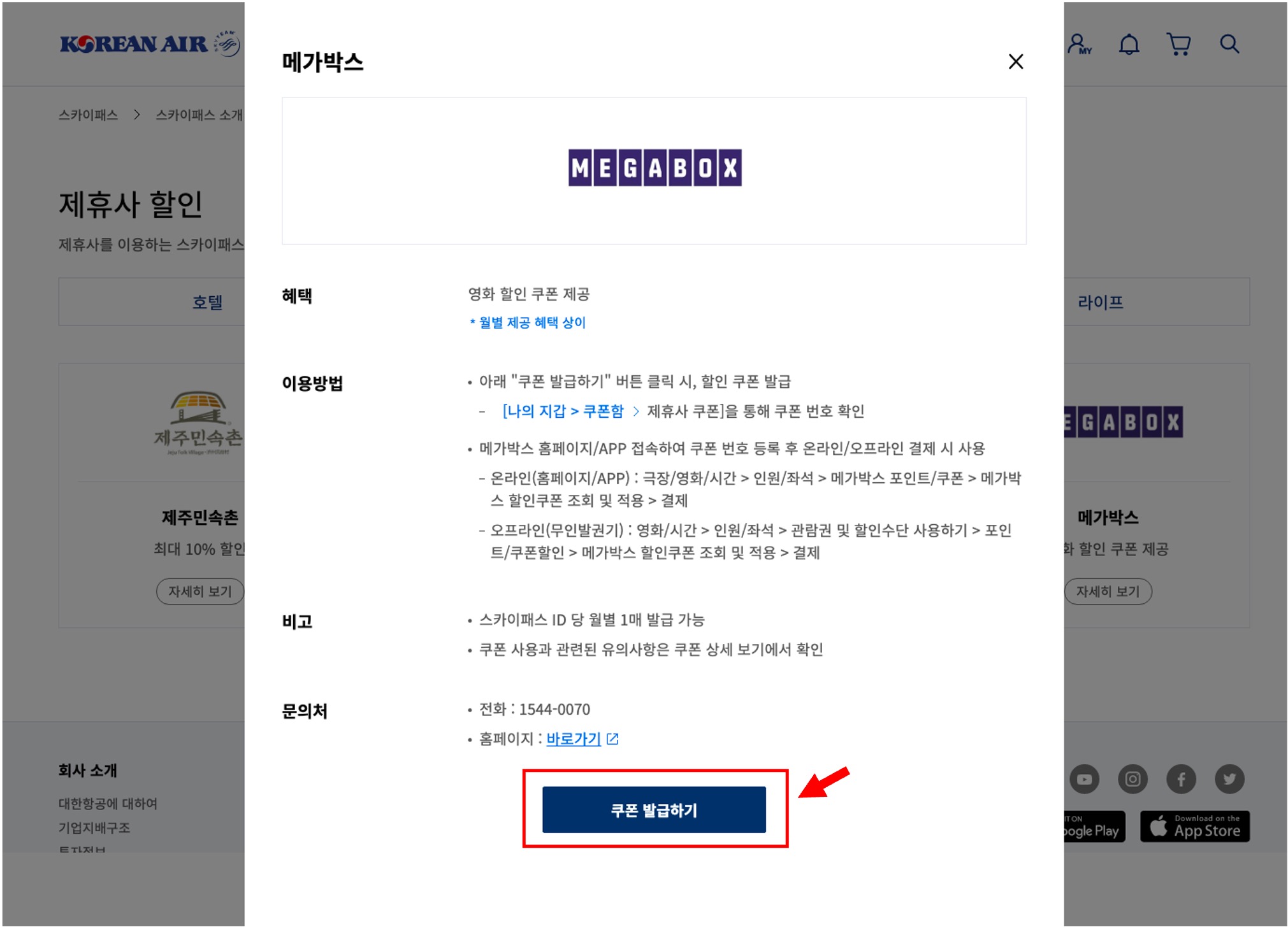 - 대한항공 홈페이지 > 스카이패스 > 스카이패스 소개 - 제휴사 할인 > 공연/문화 > 메가박스 '자세히 보기' 버튼 클릭 후 팝업창 하단 '쿠폰 발급하기' 버튼을 클릭하면 쿠폰이 발급됩니다. (대한항공 홈페이지 로그인 필요)
