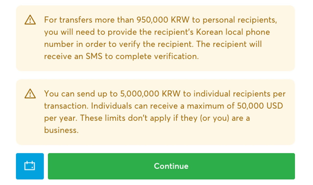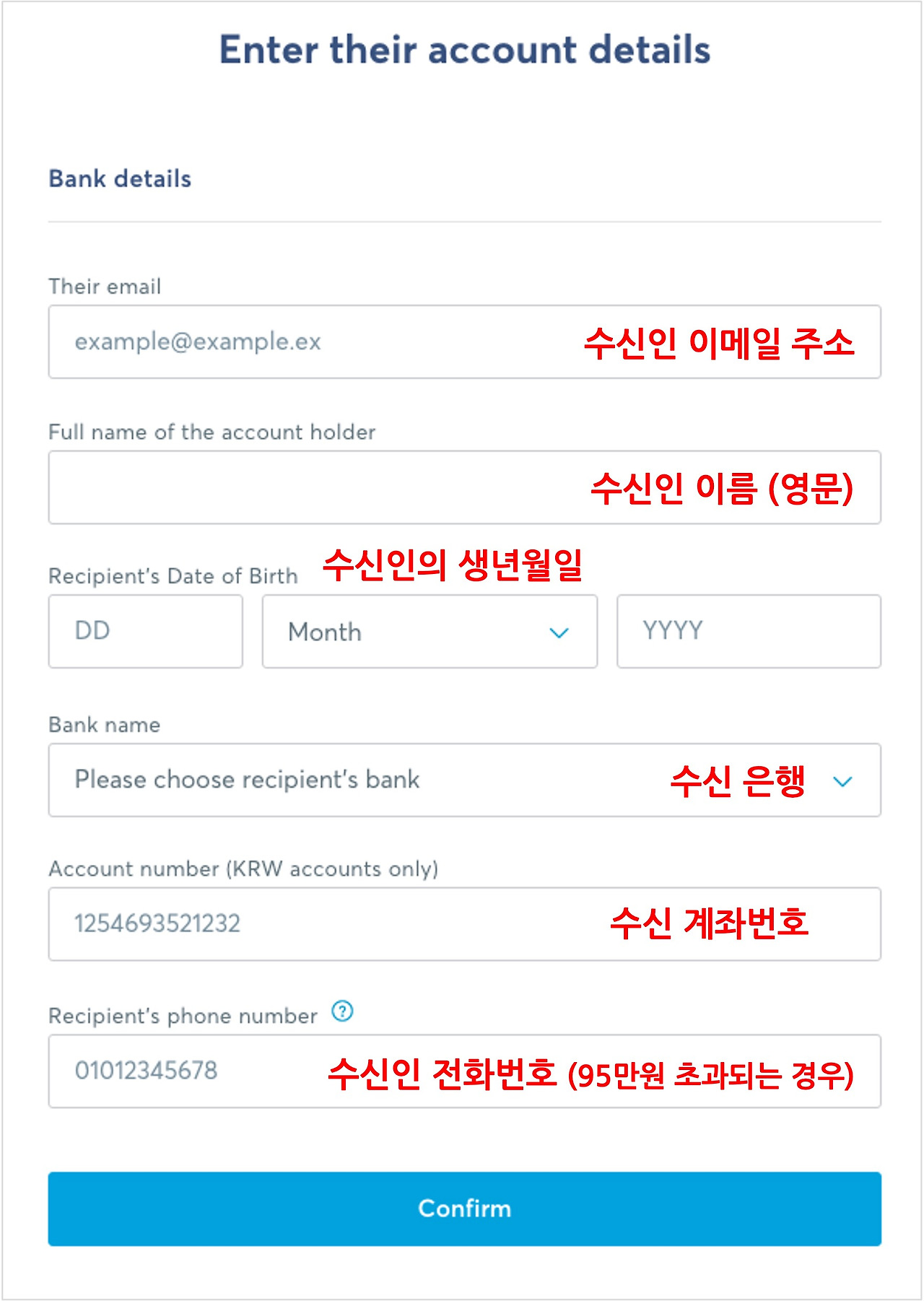 한국으로 송금하는 금액에 대해 개인 이용자에게 950,000원 이상을 송금하시는 경우 수신인의 한국 전화번호를 입력하셔야 합니다. 입력하신 전화번호로 수신자에게 문자가 보내지는데, 수신자가 이 문자를 통해 확인절차를 마쳐야 송금이 완료됩니다.
