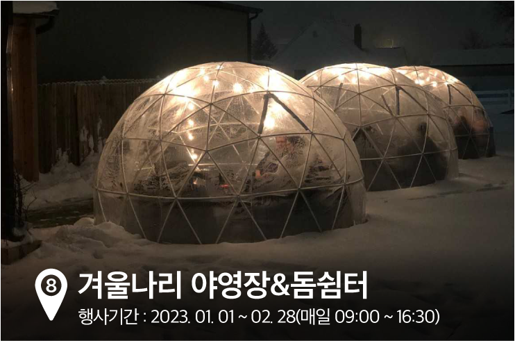 눈꽃축제 기간에는 위 사진의 '겨울 나리 야영돔'이 설치되는데요, 야영돔은 별도의 예약없이 행사기간 내 선착순 이용 가능하다고 합니다. 겨울 나리 야영돔 개장기간은 2023년 1월 1일 - 2월 28일, 운영시간은 24시간, 관리인 상주는 오전 10시부터 6시까지입니다.