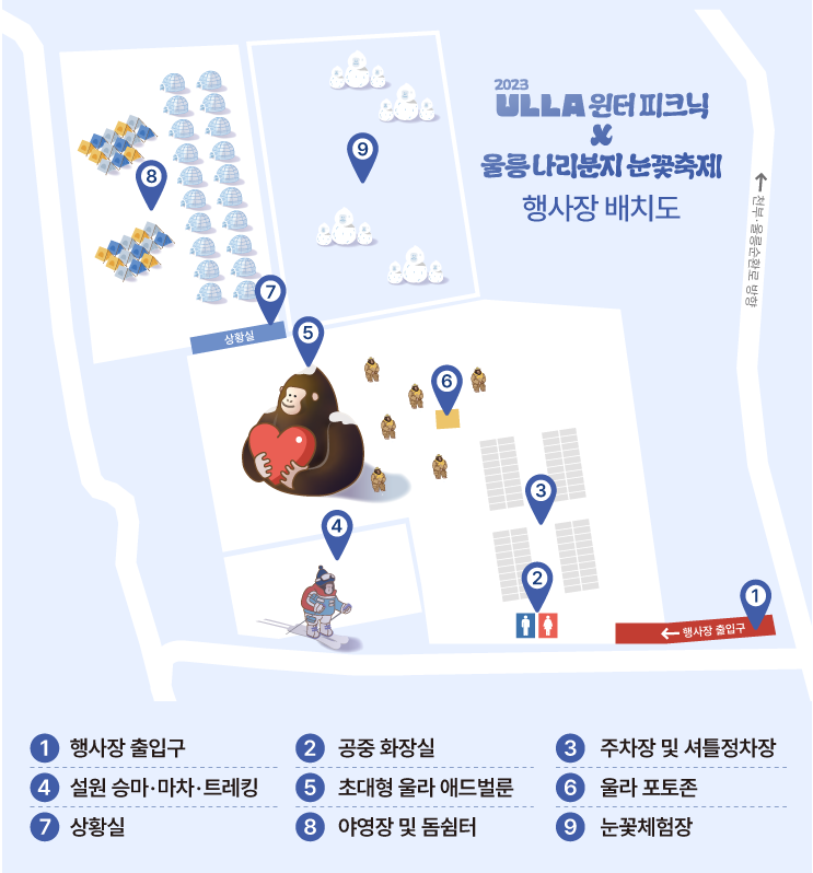 우선 축제 행사장 배치도를 보면, (2) 공중 화장실, (3) 주차장 및 셔틀정차장, (8) 야영장 및 돔쉼터 등 부대시설이 마련되어 있고 (4) 설원 승마, 마차, 트레킹, (5) 초대형 울라 애드벌룬, (6) 포토존, (9) 눈꽃 체험장과 같은 다양한 행사 및 체험 시설이 마련되어 있는 걸 확인할 수 있습니다.