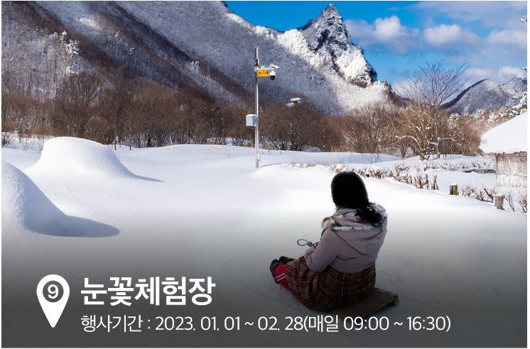 눈꽃 체험장에서는 눈사람 만들기, 이글루 체험이 가능하고 대한민국에서 최대 적설량의 나리분지에 높게 쌓인 눈 언덕에서 비료포대 눈썰매를 즐길 수 있다고 해요. 눈꽃 체험장은 무료이고, 행사기간 중 매일 오전 9시-오후 4시30분 동안 이용 가능하다고 합니다.