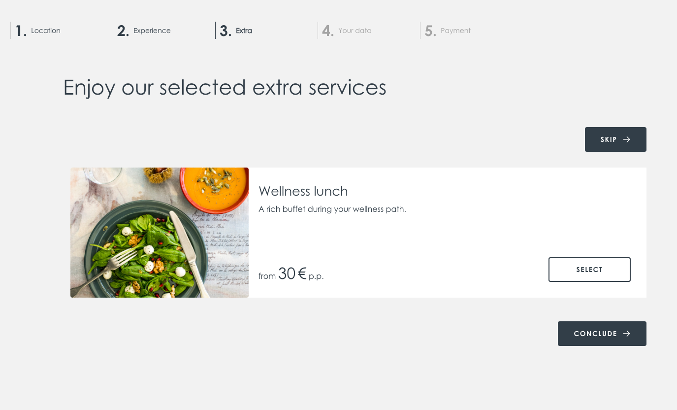 입장 시간 선택까지 마치셨다면, 오전에 입장하시는 분들은 점심식사를 추가할 것인지 선택할 수 있습니다. 가격은 인당 30 유로이고 식사 시간을 12시부터 2시까지 30분 단위로 선택할 수 있습니다. 점심식사 추가를 하지 않으시면 SKIP 버튼을 눌러주시면 됩니다.