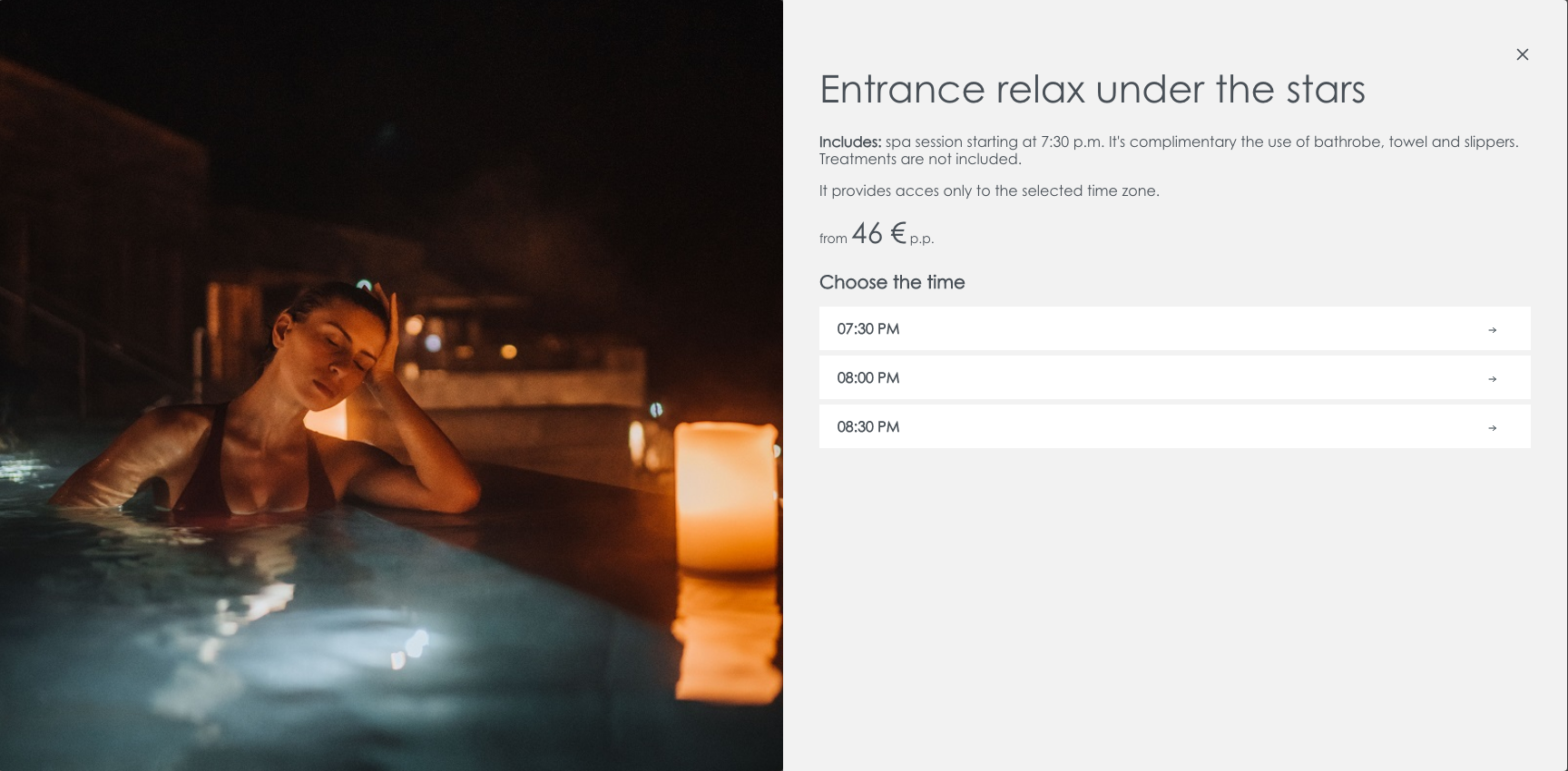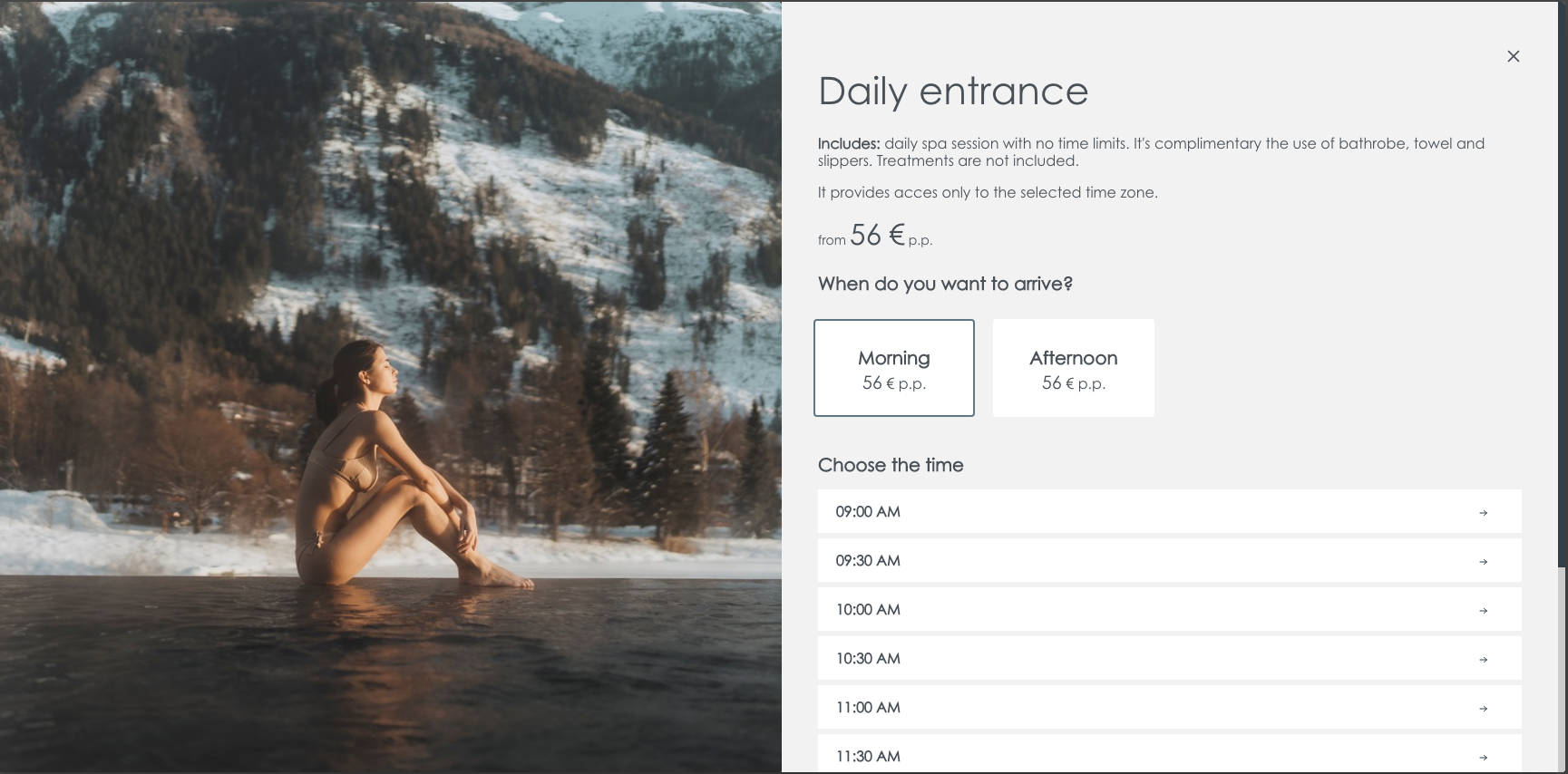 예약 첫 화면에서 방문 인원수와 방문 날짜를 선택하고 다음으로 넘어가시면 아래와 같이 상품을 선택하는 화면이 나옵니다. 'Spa entrances' 상품 중 왼쪽부터 시간 관계없이 입장하실 수 있는 종일권(Daily entrance), 오후 5시 30분부터 입장 가능한 초저녁 입장권(Evening entrance), 오후 7시 30분 부터 입장 가능한 저녁 입장권(Entrance relax under the stars) 중 선택하실 수 있습니다.